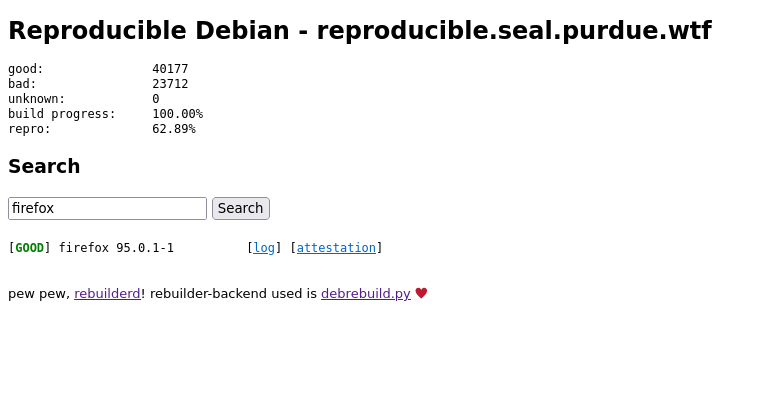 If you’ve been following my twitter recently you probably noticed there’s now a rebuilderd based Debian rebuilder run by the Purdue Trustworthy Software Ecosystems Lab. The rebuilder backend - the code that’s actually re-creating the build environment and running the build - is debrebuild.py, written by Frédéric Pierret from the QubesOS project. The setup as a whole automatically monitors packages in Debian unstable, then downloads the source code, build-dependencies and attempts to compile a bit-for-bit identical binary package. If this succeeds, the package is marked as “reproducible”.